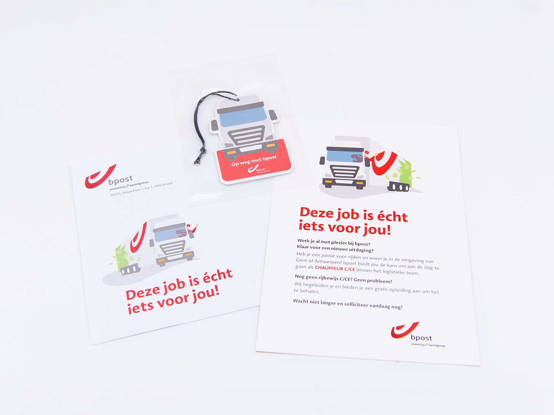 Om het nijpende tekort aan vrachtwagenchauffeurs aan te vullen, besloot bpost om een sterke interne campagne te voeren. Uiteraard zette Perka daar graag haar schouders onder. bpost kwam met het idee van een catchy item om de aandacht te trekken. Resultaat? Een geurhanger met kokosgeur in de vorm van een vrachtwagencabine. Perka zorgde voor de uitvoering ervan. Een tof incentive dat bij elke ontvanger beslist zou blijven hangen.